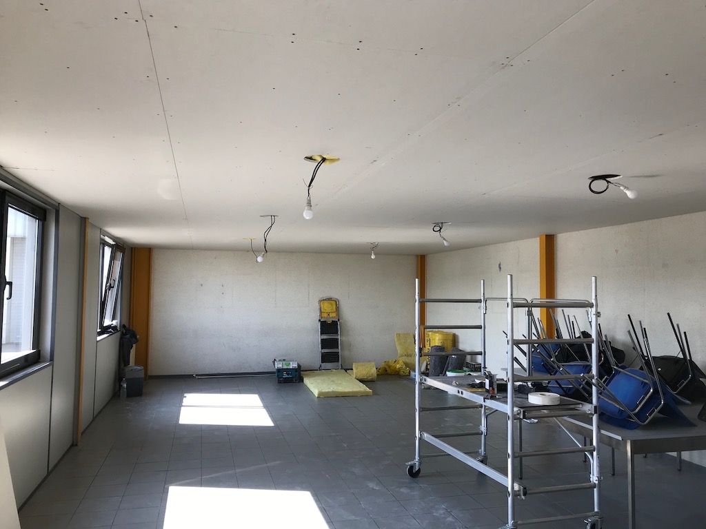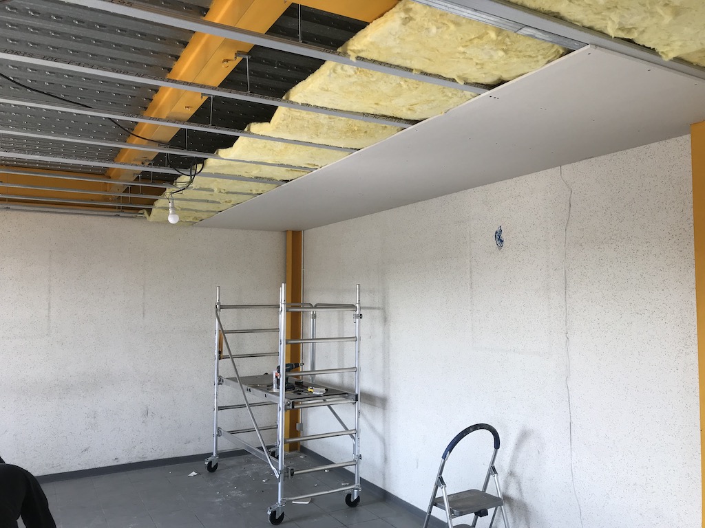 Ponçage des murs initialement revêtus d’une peinture pailletée projetée, ré-enduisage des murs