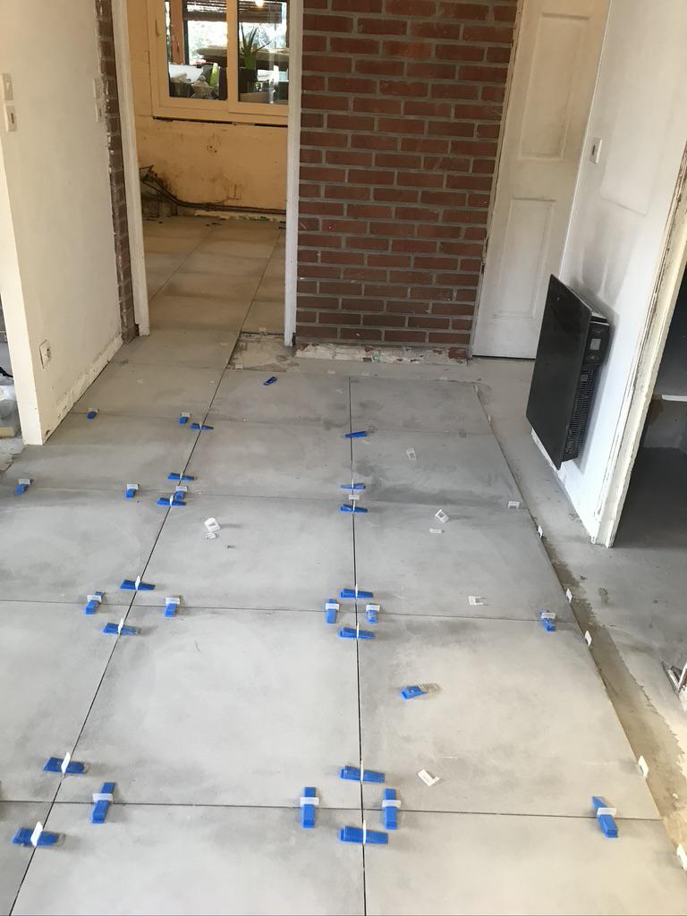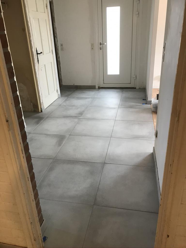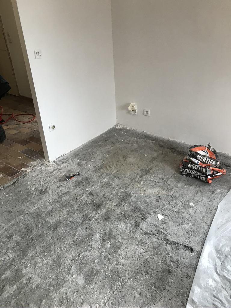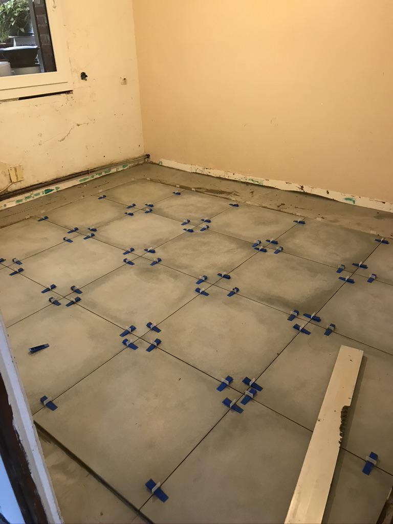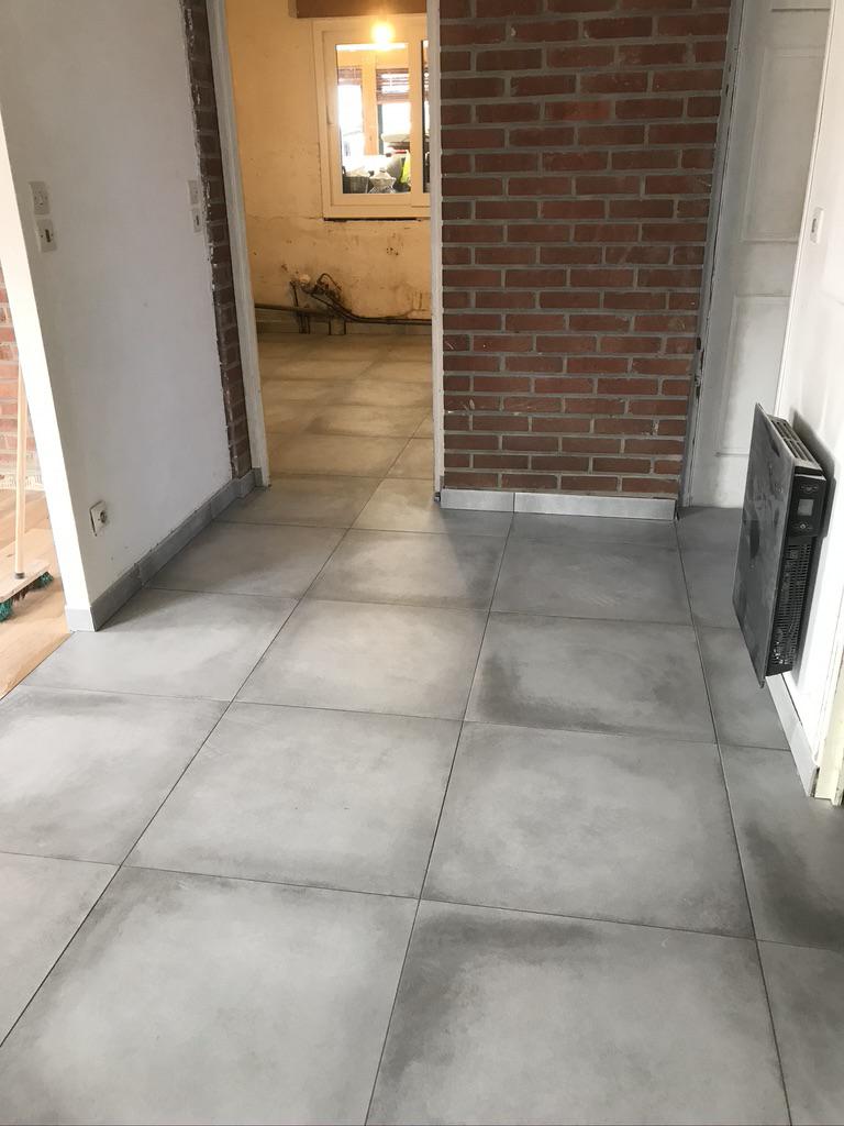 Pose d’un carrelage 60x60 en double encollage avec traitement des joints + pose de plinthes assorties