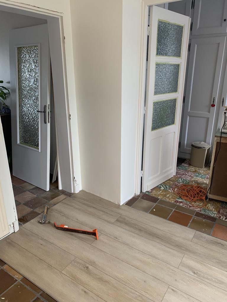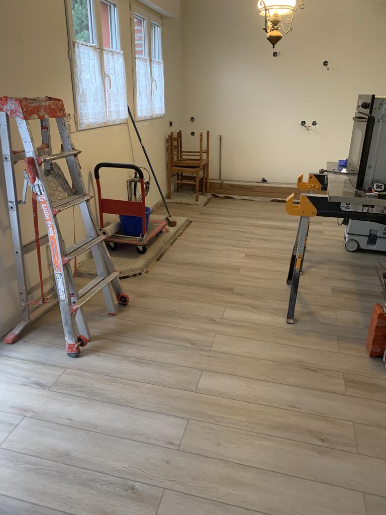 Pour le sol, pose d’un revêtement parquet vinyl Coretec Proplus décor “Mirage” [Domaine Sol et Mur Nieppe]